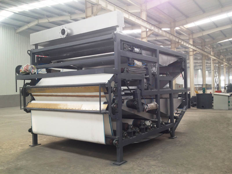 污泥經(jīng)輸送泵進入動(靜)態(tài)混合器,與同時加入的濃度為0.05~0.1%陰(陽)離子絮凝劑溶液相混合并充分反應(yīng)后,渣(泥)漿中的微小固體顆粒(或懸浮物)聚凝成體積較大的絮狀團塊,物料間的結(jié)合水及表面水被分離成自由水,當物料被輸送鋪展到加長的重力預(yù)脫水區(qū)(或污泥脫水機上)的濾網(wǎng)上,在重力的作用下自由水透過濾網(wǎng)背面而滲出分離,形成不流動狀態(tài)的污泥,達到壓榨脫水區(qū)實施最大壓力條件,然后隨著網(wǎng)帶的移動而夾持在上下兩條網(wǎng)帶之間,經(jīng)過具有可調(diào)張緊力的過濾帶及直徑逐漸遞減的轉(zhuǎn)輯和對壓輯,實施連續(xù)增加的緩慢的對輟擠壓力、剪切力作用,通過形區(qū)、低壓區(qū)、中壓區(qū)、高壓區(qū)和強力對銀擠夾區(qū)將渣(泥)漿中的水份經(jīng)過逐級增壓的方式不斷擠壓出來,最后形成含水率較低的濾餅排出,通過刮料板刮離,上下濾帶分開,經(jīng)過高壓沖洗水及滾刷清除濾網(wǎng)表面孔隙中的微量顆粒,繼續(xù)進入下一步脫水循環(huán)。